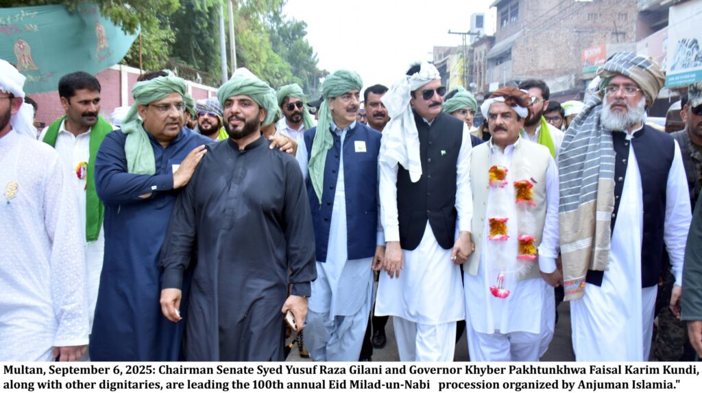 تقریب کے بعد 12 ربیع الاول کا جلوس چیئرمین سینیٹ اور گورنر خیبر پختونخوا کی قیادت میں دولت گیٹ سے روانہ ہوا اور حسین آگاہی چوک پہنچ کر اختتام پذیر ہوا۔