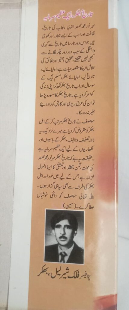 مہرنور محمد تھند جنوبی پنجاب کی تاریخ ثقافت اور ادب کے ایسے شناور اور کھوجی ہیں جو اس دورنارسا میں تاریخ سے گہری وابستگی کے سبب دوردور چکر لگانے سے کبھی نہیں تھکتے،تحقیق و جستجواور حقائق کی تلاش انکا مقصدحیات ہے اولیائے لیہ،تاریخ لیہ اولیائے بھکر مسلم لیگ کے سوسال اور اب تاریخ بھکر لکھ کر اپنی زندگی کو امر کردیا ہے تایخ بھکر کا مسودہ پڑھا تو انکی عرق ریزی اور کاوش کو داد دئیے بغیر نہ رہ سکا ۔ موصوف نے تاریخ بھکر مرتب کرکے اہل بھکر کو مقروض کردیا ہے میرے نزدیک یہ نادر تصنیف و تالیف بھکر کے باسیوں اور لکھاریوں کے لئیے ایک عظیم سرمایہ ہے حقیقت یہ ہے کہ تاریخ بھکر مہر نور محمد تھند کی محنت لگن تفقد اور تعشقکا ایسا انمول خزانہ ہے جس کے لئیے میں خود اور اہل بھکر کی طرف سے بھی سپاہی گزار ہوں،اللہ تعالی موصوف کو دائمی خوشیاں عطا کرے۔آمین۔ پروفیسر فلک شیر لیل بھکر