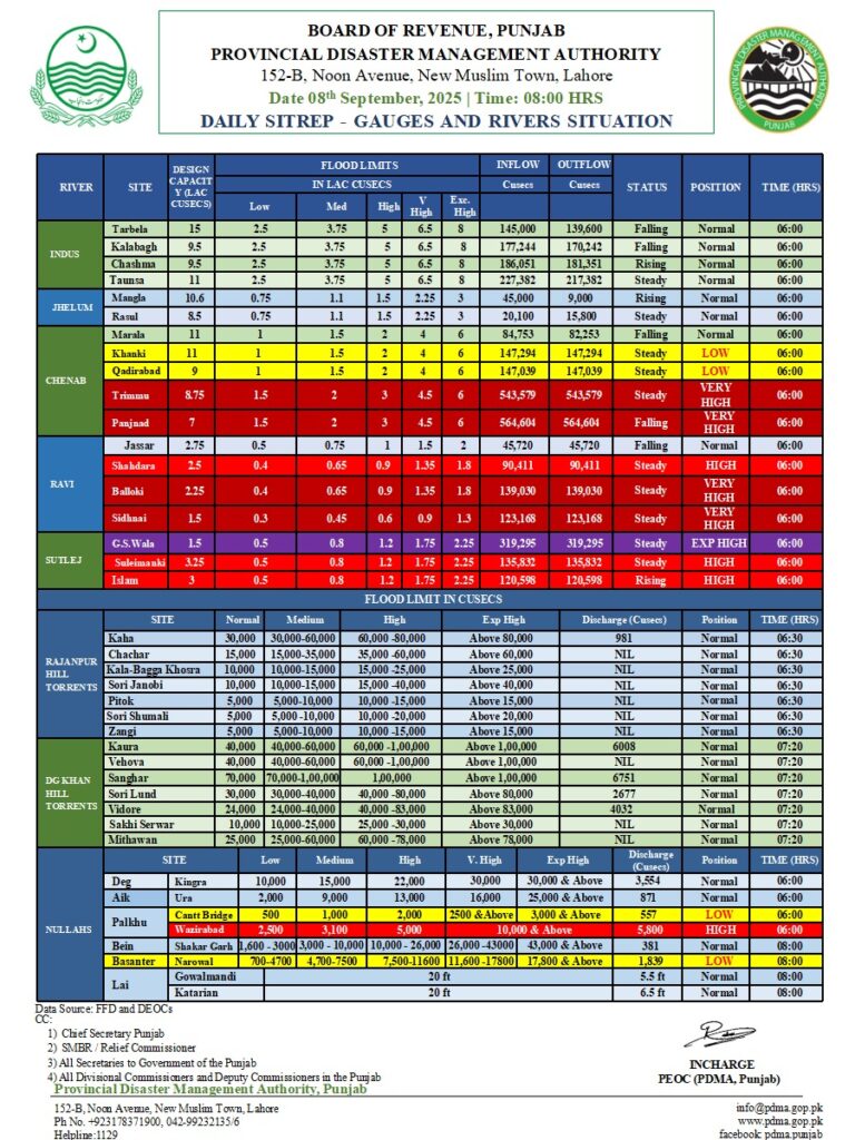 ڈی جی پی ڈی ایم اے عرفان علی کاٹھیا کے مطابق 9 ستمبر تک دریائے راوی، ستلج اور چناب میں انتہائی اونچے درجے کے سیلاب کا خدشہ ہے، کیونکہ بالائی علاقوں میں بارشوں کے باعث پانی کے بہاؤ میں غیر معمولی اضافہ متوقع ہے۔انہوں نے مزید کہا کہ وزیراعلیٰ پنجاب کی ہدایات پر تمام متعلقہ محکمے الرٹ ہیں اور شہریوں کی جان و مال کے تحفظ کیلئے تمام وسائل بروئے کار لائے جا رہے ہیں۔