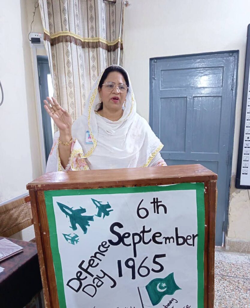 تقریب سے خطاب کرتے ہوئے پرنسپل محترمہ عظمیٰ جعفری نے کہا کہ یومِ دفاع ہمیں 6 ستمبر 1965ء کی یاد دلاتا ہے جب افواجِ پاکستان نے دشمن کے ناپاک عزائم کو ناکام بنا کر پوری قوم کا سر فخر سے بلند کیا۔ انہوں نے کہا کہ پاک فوج نے پہاڑوں سے لے کر صحراؤں تک ہر محاذ پر بے مثال بہادری اور قربانیوں کی داستان رقم کی۔