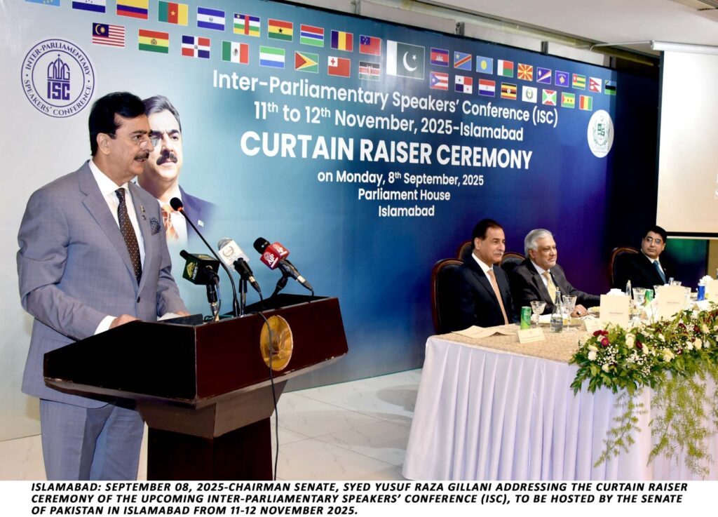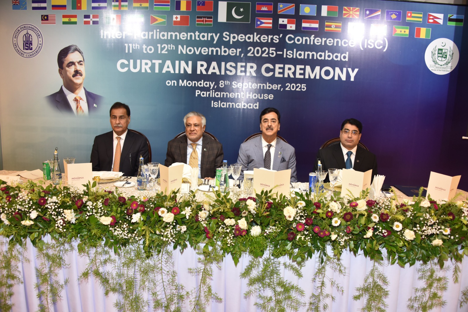 ایوان بالا کی جانب سے رواں برس نومبر میں اسلام آباد میں منعقد ہونے والی انٹر پارلیمنٹری اسپیکرز کانفرنس (ISC) کی باقاعدہ تشہیری تقریب (کرٹن ریزر) پارلیمنٹ ہاؤس میں منعقد ہوئی، جس میں پارلیمانی رہنماؤں، سفارتکاروں اور اعلیٰ حکام نے بڑی تعداد میں شرکت کی۔ تقریب میں 38 ممالک کے سفراء اور بین الاقوامی تنظیموں کے نمائندگان شریک ہوئے، جو پاکستان کی اس اہم سفارتی اور پارلیمانی کاوش میں بھرپور عالمی دلچسپی اور تعاون کا مظہر ہے۔