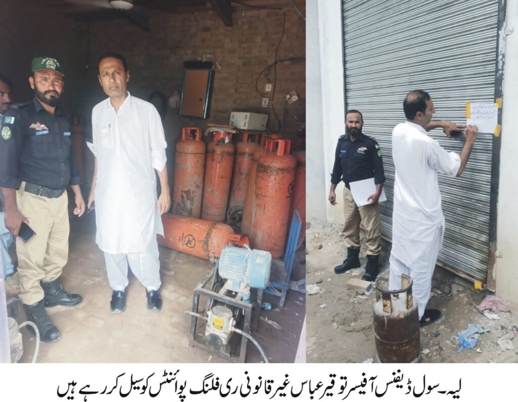 لیہ — ڈپٹی کمشنر/کنٹرولر سول ڈیفنس امیر ابیدار کی ہدایت پر سول ڈیفنس کی ٹیم نے غیر قانونی ایل پی جی ری فلنگ کے خلاف بھرپور کارروائی کی ہے۔ سول ڈیفنس آفیسر محمد توقیر عباس نے شہر کے مختلف مقامات کا اچانک معائنہ کیا جس دوران غیر قانونی طور پر قائم ایل پی جی ری فلنگ پوائنٹس کو سیل کر دیا گیا اور تھانہ سٹی لیہ میں تین ایف آئی آرز درج کروائی گئیں۔