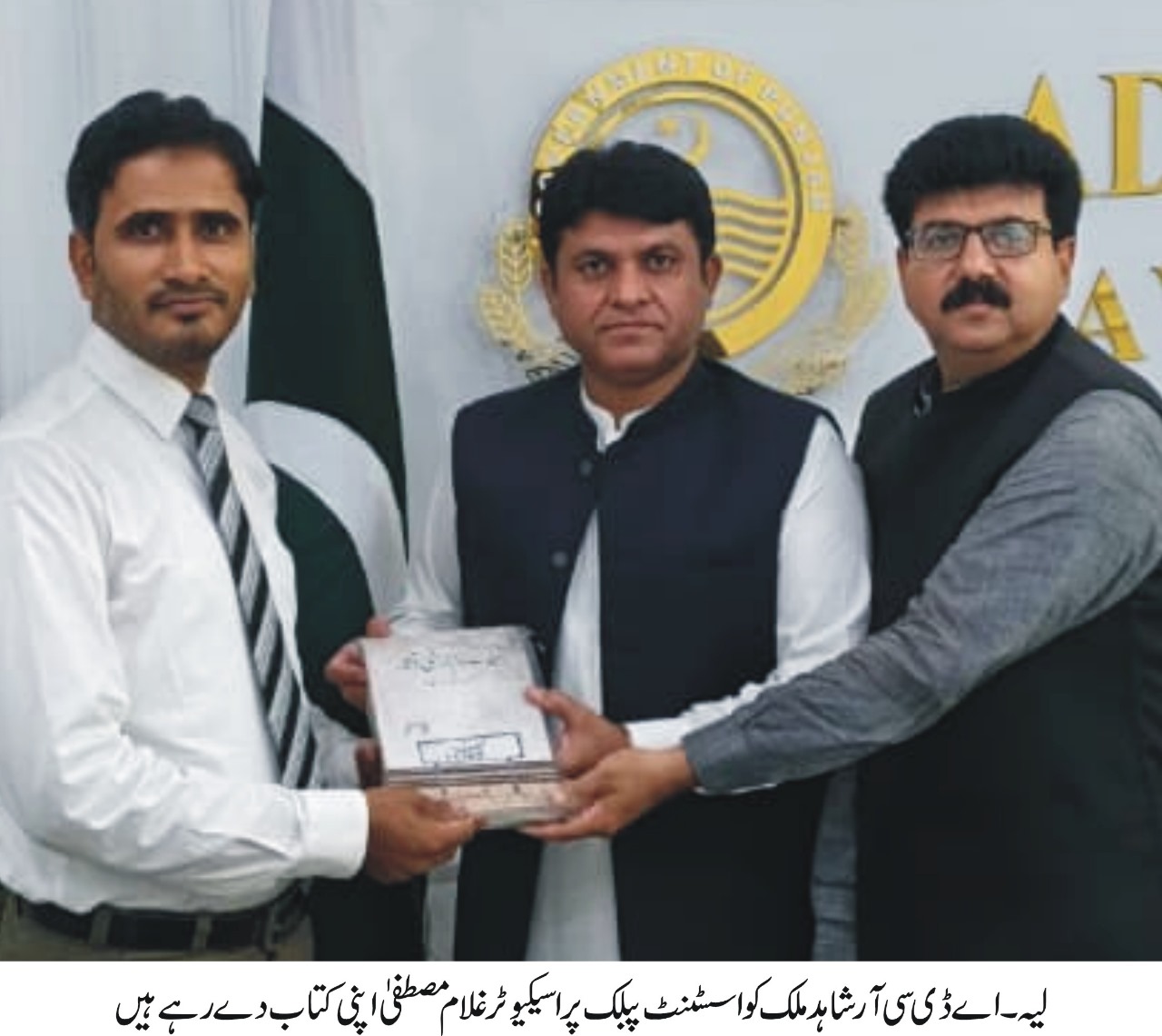 لیہ: ایڈیشنل ڈپٹی کمشنر ریونیو محمد شاہد ملک کو اسسٹنٹ پبلک پراسیکیوٹر غلام مصطفی نے اپنی تازہ تصنیف "لیہ کے تاریخی آثار (مشاہداتی تاریخ)” پیش کی۔ اس موقع پر صدر ڈسٹرکٹ بار ایسوسی ایشن بہرہ یاب خان بھی موجود تھے۔
