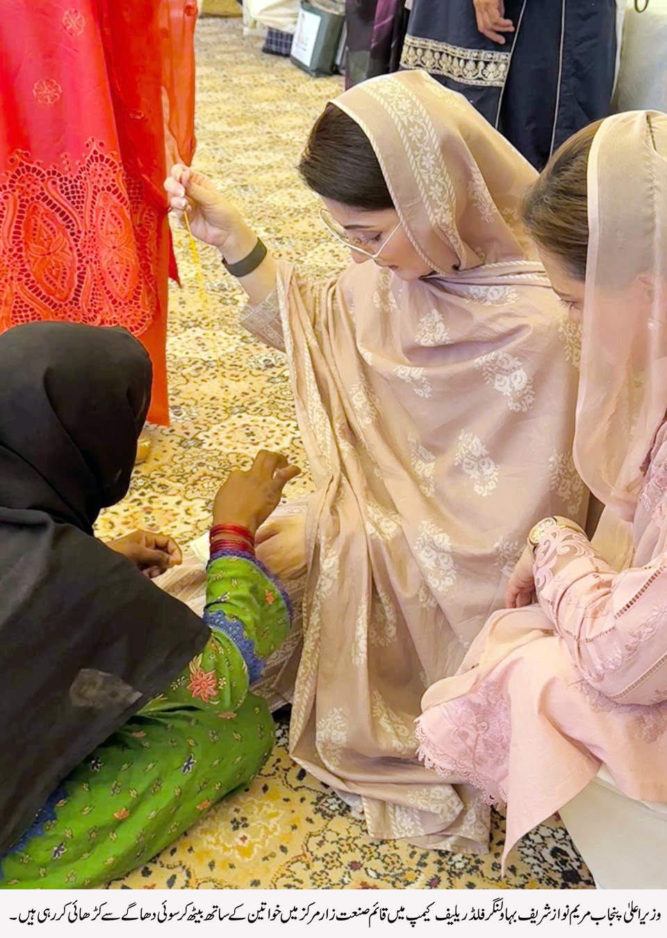 مریم نواز نے کیمپ میں قائم صنعت زار مرکز کا بھی معائنہ کیا اور سلائی کڑھائی کرنے والی خواتین سے خوشگوار موڈ میں گفتگو کی۔ انہوں نے خود سلائی مشین پر کپڑے کی سلائی کی اور فریم میں لگے کپڑے پر کڑھائی بھی کی، جس پر خوشی کا اظہار کیا۔