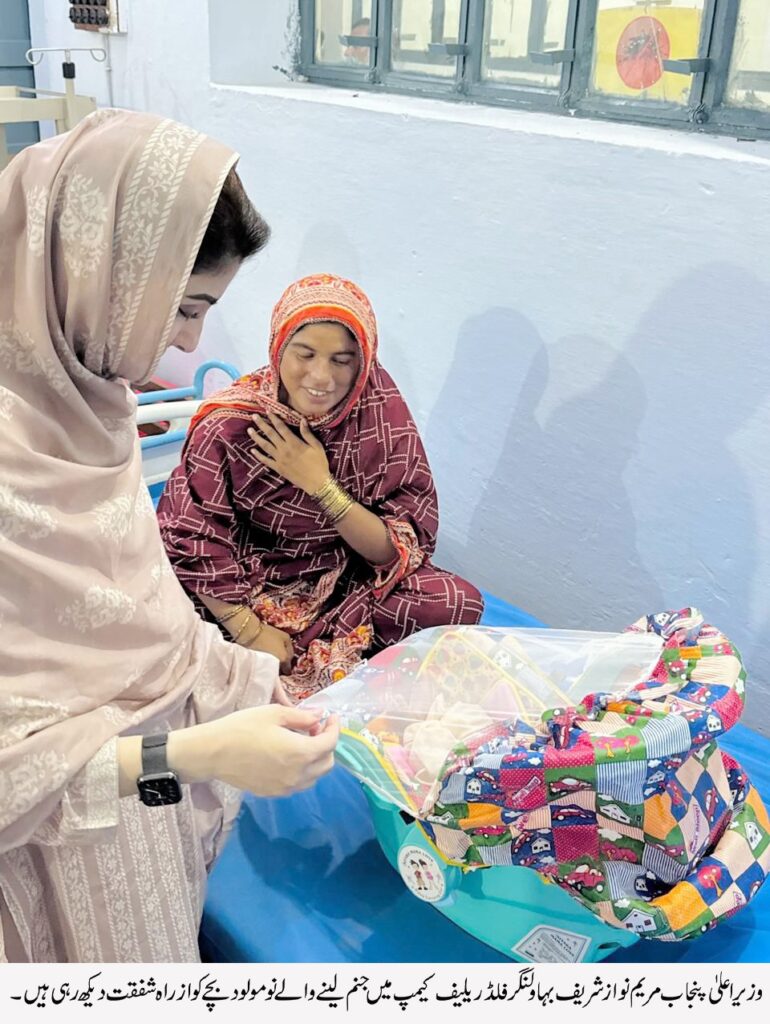 وزیراعلیٰ مریم نواز نے فلڈ ریلیف کیمپ میں پیدا ہونے والے بچوں کے والدین سے ملاقات کی، مبارکباد پیش کی اور نیک تمناؤں کا اظہار کیا۔ اس موقع پر کیمپ میں پیدا ہونے والے بچے کا نام نواز شریف اور بچی کا نام مریم رکھا گیا۔