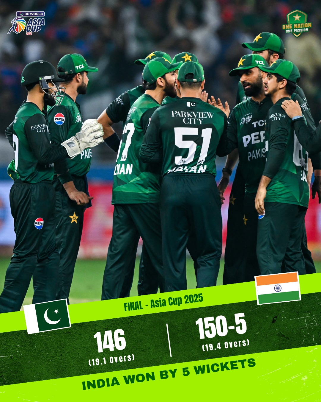دبئی — ٹی ٹوئنٹی ایشیا کپ 2025 کے فائنل میچ میں بھارت نے پاکستان کو سنسنی خیز مقابلے کے بعد 5 وکٹ سے شکست دے کر ایشیا کپ جیتا۔ یہ فائنل دبئی انٹرنیشنل کرکٹ سٹیڈیم میں ہوا جہاں دونوں ٹیموں نے تماشائیوں کو ایک یادگار مقابلہ دکھایا۔