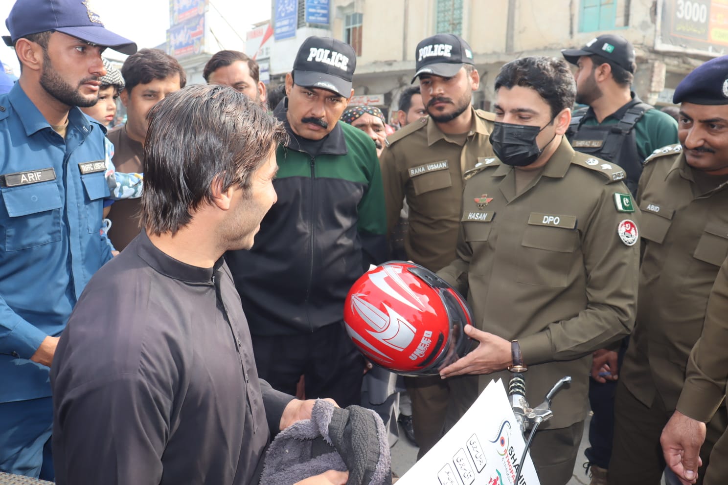 بعد ازاں ڈی پی او لیہ حسن جاوید بھٹی نے ڈی ایس پی ٹریفک ظفر اقبال اور دیگر پولیس افسران کے ہمراہ لیہ مائنر سمیت مختلف مقامات پر موٹر سائیکل سوار شہریوں میں بھی مفت ہیلمٹ تقسیم کیے۔