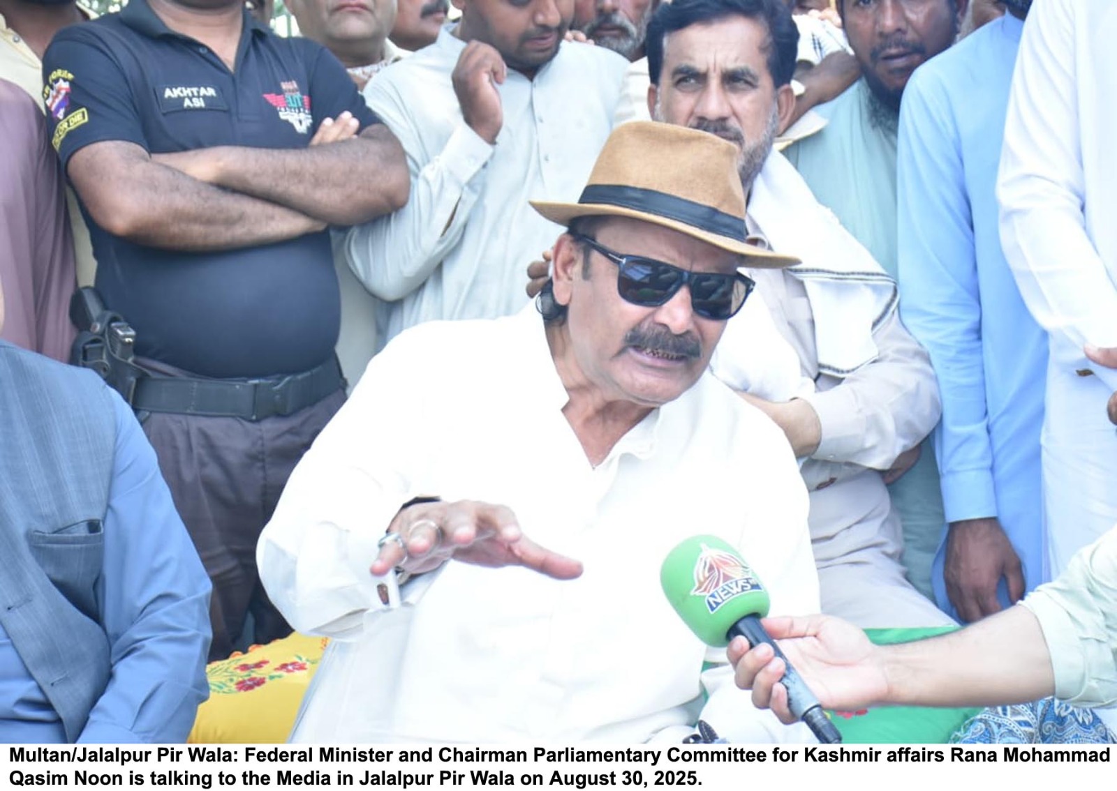 وفاقی وزیر اور چیئرمین پارلیمانی کمیٹی آن کشمیر رانا محمد قاسم نون نے ہفتہ کو تحصیل جلالپور پیر والا (ملتان) میں سیلاب متاثرہ علاقوں کا دورہ کیا اور متاثرہ شہریوں سے ملاقات کی۔
